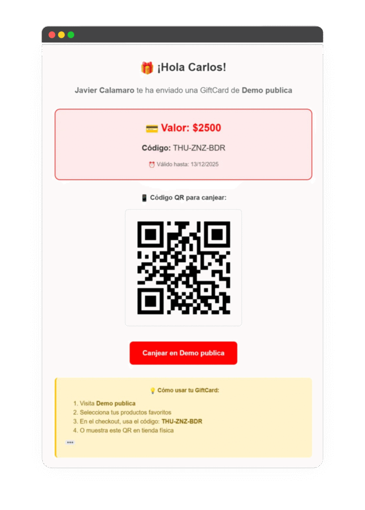 Cuando un cliente (emisor) completa la compra de una GiftCard para otra persona.Qué contiene el email: