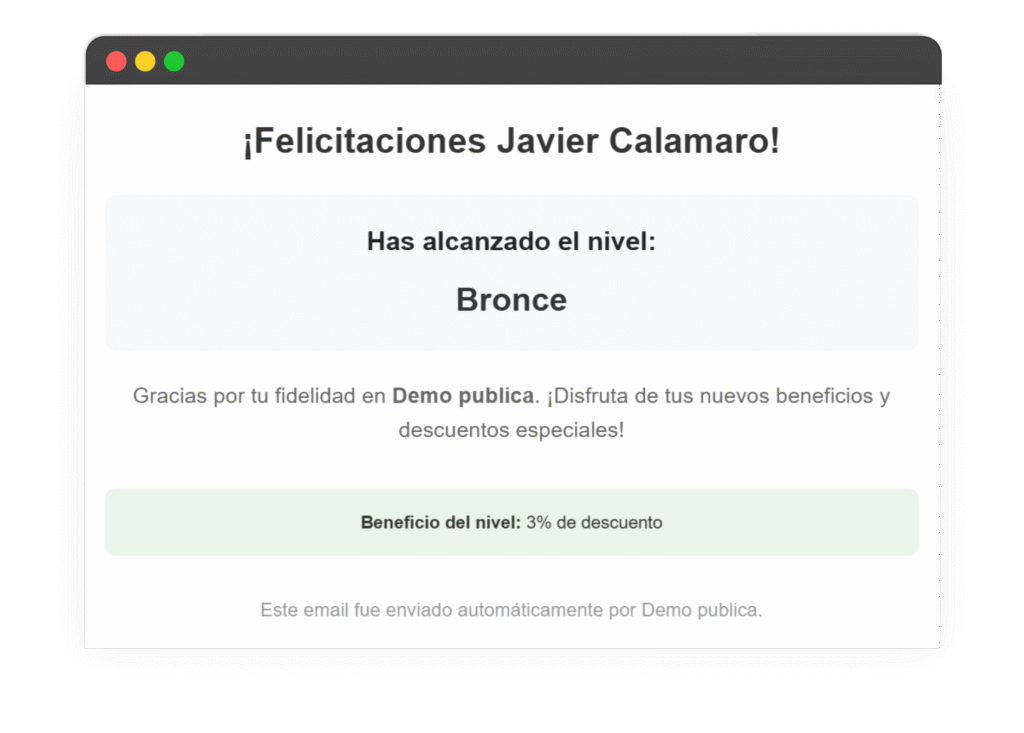 Cuándo se envía: Cuando un cliente acumula los puntos necesarios y pasa a un nuevo nivel de tu programa (por ejemplo, de “Inicial” a Bronce, o de Bronce a Oro).